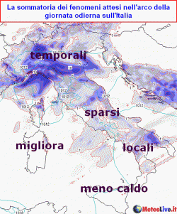 OGGI: sulla Sardegna tendenza a miglioramento; al nord e al centro nuvolosità irregolare, a tratti intensa con possibili rovesci sparsi o brevi temporali, dapprima sul Mar ligure e sul Piemonte, poi possibili ovunque. Al sud passaggi nuvolosi con locali piovaschi, nel pomeriggio formazione di focolai temporaleschi nelle zone interne ed appenniniche, asciutto sulla costa. Temperature gradevoli al nord e al centro, ancora caldo, ma in parziale attenuazione al sud.