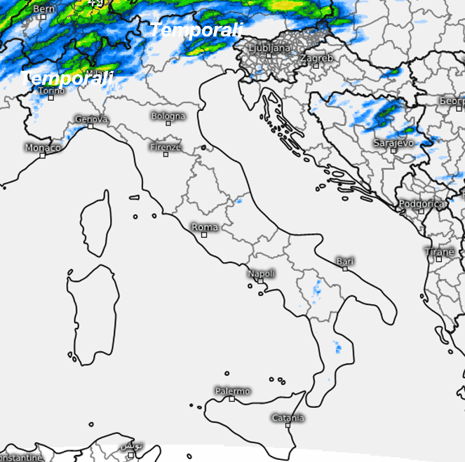 L’alta pressione si assesta sul Mediterraneo e contemporaneamente tende a flettere sulle regioni settentrionali, in particolare sui settori alpini. Una lunga perturbazione si sta appoggiando alla chiostra montuosa e determina già rovesci e temporali che per il momento non sconfinano in pianura.