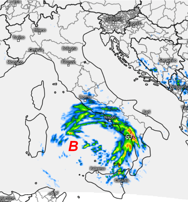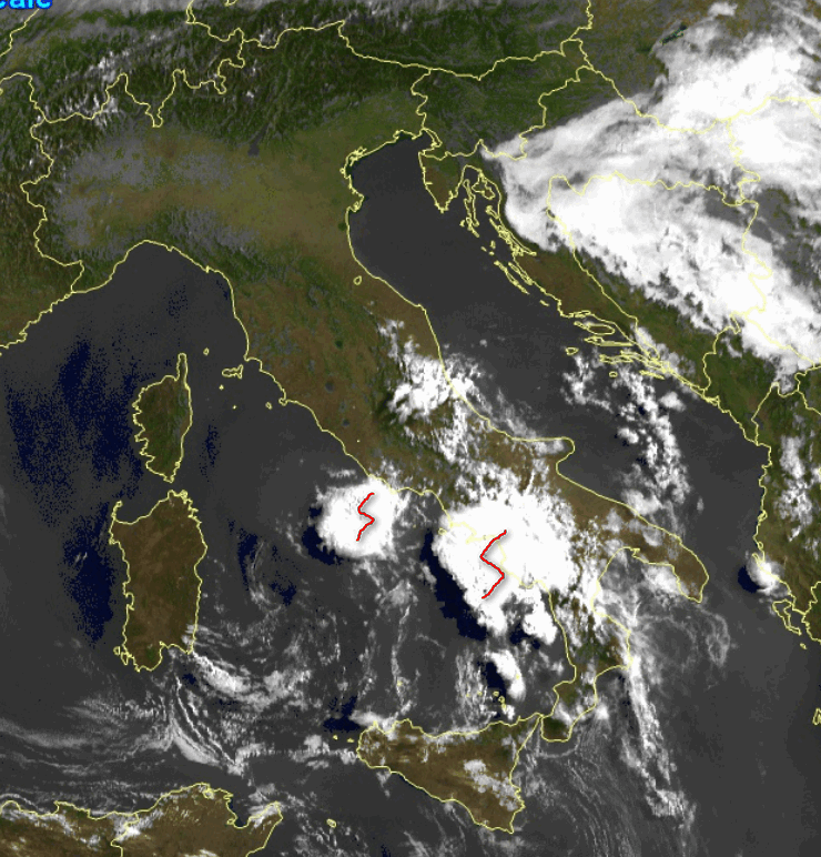 Notiamo grossi ammassi temporaleschi tra il Cilento e la Calabria Tirrenica. Sono gli effetti della goccia fredda che per un paio di giorni agirà sulle nostre regioni meridionali. Di notte e al mattino i temporali saranno più probabili in mare aperto e lungo le coste, mentre nel pomeriggio nei settori interni.