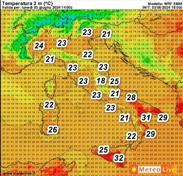 Valori complessivamente gradevoli in Italia, un po’ caldo sulle estreme regioni meridionali, con punte di 32° in Sicilia.