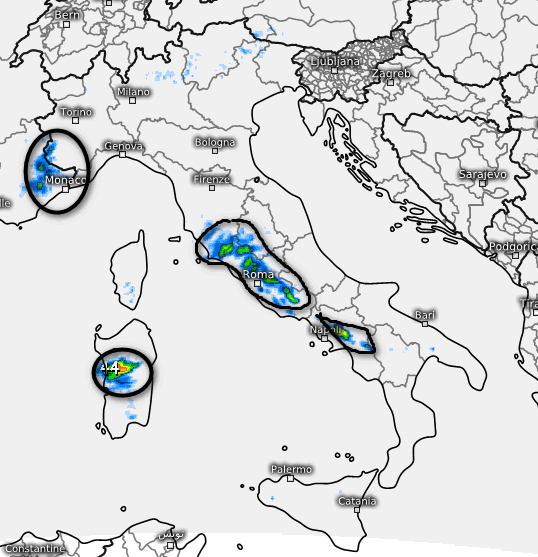 Questi invece sono i temporali di calore attesi in Italia tra le 14 e le 20 di mercoledi 13 agosto: