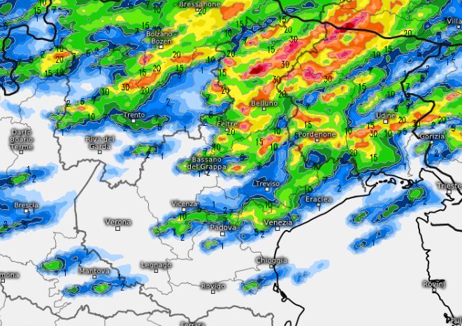 Tutto il Cadore coinvolto da precipitazioni rilevanti, l’alto Trentino (fuori invece la Vallagarina) e l’alto Adige (comprese le vallate dolomitiche) e poi Vicentino, Padovano, Trevigiano e Veneziano. L’area più colpita entro notte sarà quella del Friuli Venezia Giulia, dove potrebbero scatenarsi autentici nubifragi, specie nel Pordenonese, con possibili grandinate e raffiche di vento violentissime, dilaganti in tutte le direzioni dai nuclei temporaleschi.
