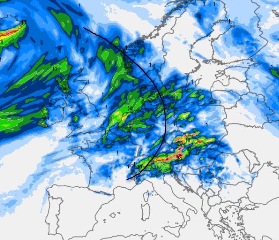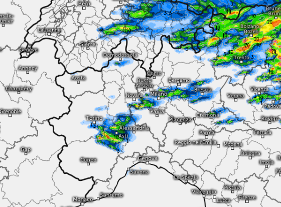 La ventilazione occidentale e la scarsa capacità di penetrazione della saccatura sul settentrione determinerà una parziale ombra pluviometrica sul nord-ovest, che di rovesci temporaleschi ne vedrà ben pochi, anche se qualche “focolaio” potrebbe riuscire comunque a formarsi tra Astigiano, Alessandrino, Lomellina, parte del Milanese, bassa bergamasca e Bresciano, come si vede nella mappa qui sotto: