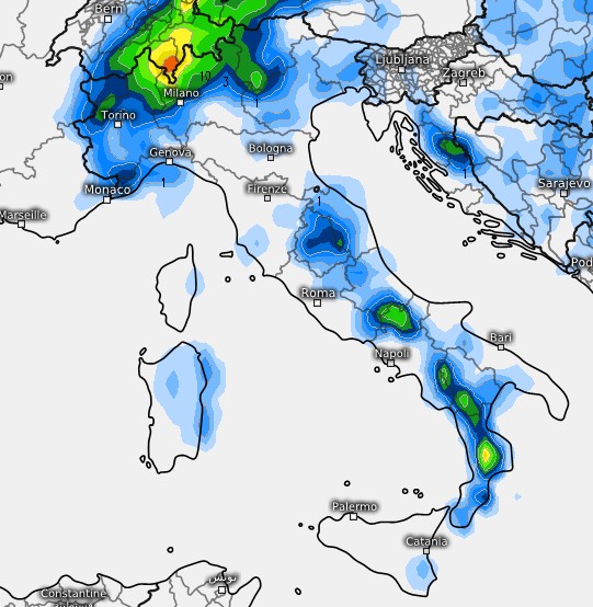 Vediamo le conseguenze a livello precipitativo entro la serata di domenica 17 di questo avvicinamento al settentrione del vortice freddo, notate i temporali su Canton Ticino ed alta Lombardia, forse anche sul Garda, le precipitazioni che si notano lungo la dorsale appenninica del centro-sud sono frutto dell’instabilità pomeridiana legata a quella blanda azione depressionaria presente sull’Egeo che restituisce correnti debolmente instabili da nord-est: