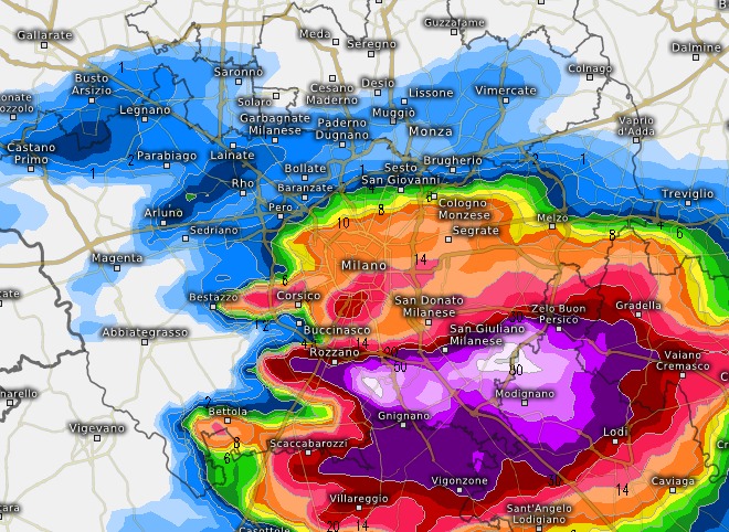 Un autentico mostro (il colore viola sottende precipitazioni anche superiori a 30mm in soli 30 minuti, cioè tutte le caratteristiche di un nubifragio), anche Milano ne sarebbe coinvolta, ma soprattutto i paesi fino a coinvolgere il Lodigiano e il Cremasco.