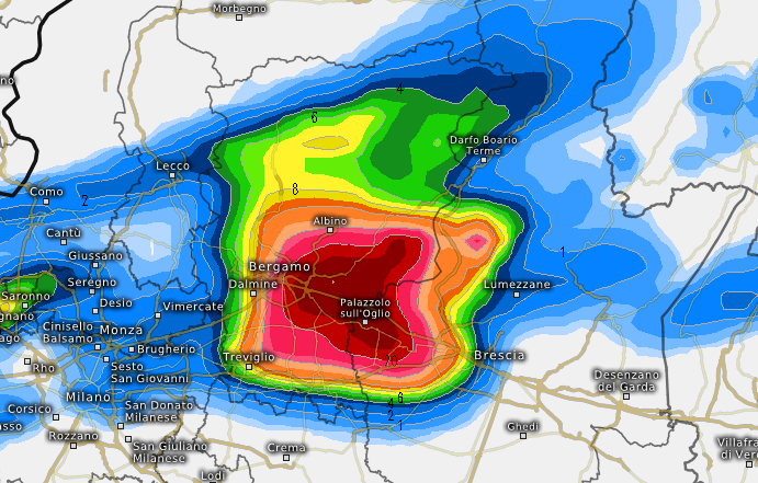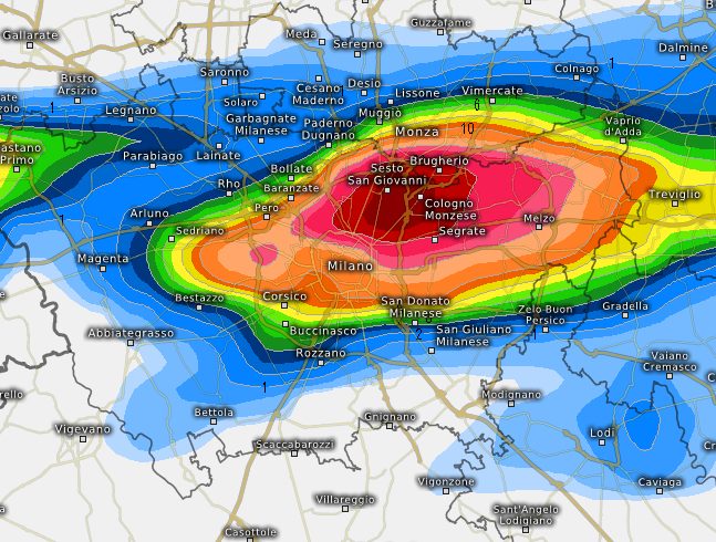 Qui il nucleo viene visto colpire in pieno l’area comprese tra il Milanese nord-orientale e parte della Brianza prima di puntare verso est, un altro modello vede invece il nucleo muoversi molto più a sud: