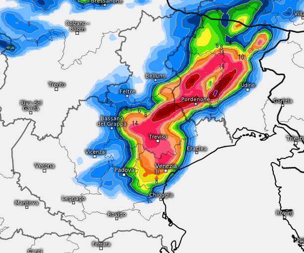 Le province più colpite dovrebbero essere quelle di Vicenza, Padova, Venezia, Treviso, Belluno, Pordenone ed Udine. Transitato questo primo impulso temporalesco tornerà temporaneamente il sereno ma il grosso del peggioramento andrà ad attivarsi nel corso della notte su sabato (dalla mezzanotte in poi ogni ora sarà buona) a partire dalla Lombardia occidentale.
