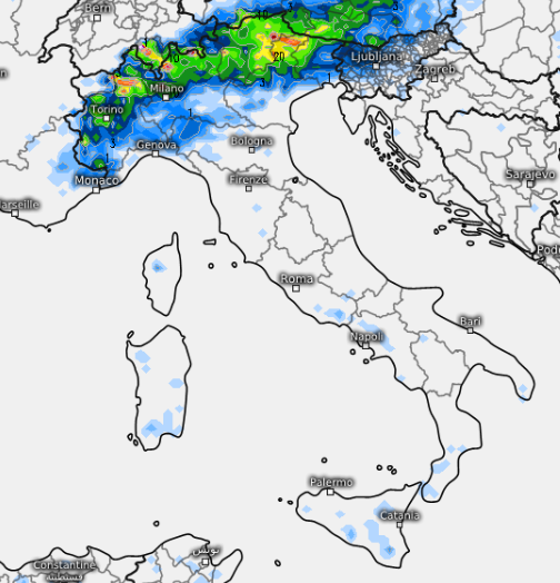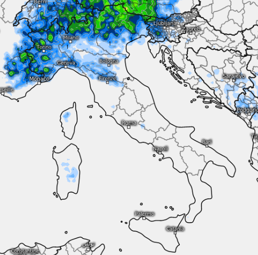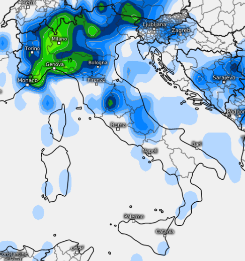 Un cambiamento più marcato i modelli come dicevamo lo fiutano per sabato 5 e domenica 6 (evoluzione peraltro ancora da confermare). Qui il modello GFS prova ad ipotizzare la distribuzione dei fenomeni per la serata di sabato 5, notate quante precipitazioni sono attive tra Liguria, Piemonte orientale, Emilia occidentale e Lombardia, Milano compresa. Da notare i focolai presenti anche lungo la dorsale appenninica del centro: