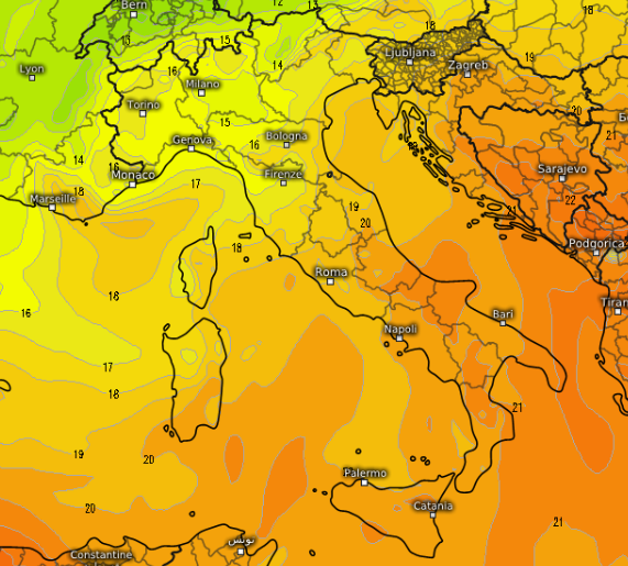 A livello termico qui a 1500m, sempre per sabato 5 luglio, risulta evidente il calo delle temperature al nord e in prospettiva su Sardegna ed alto Tirreno con contrasto evidente tra masse d’aria d’origine diversa:
