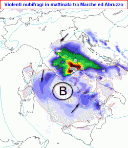 NUBIFRAGI: colpiranno Marche ed Abruzzo per gran parte della giornata, fenomeni intensi anche su Umbria e poi basso Lazio, Molise, Campania e Calabria tirrenica.
