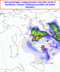Al centro instabile sul Tirreno e il nord Sardegna con temporali sparsi, più sole ma ventoso su sud Sardegna, temporali intensi, a carattere di nubifragio su Marche ed Abruzzo, specie tra Ancona e Pescara. Netto calo termico. Verso sera tendenza a miglioramento sul Tirreno.