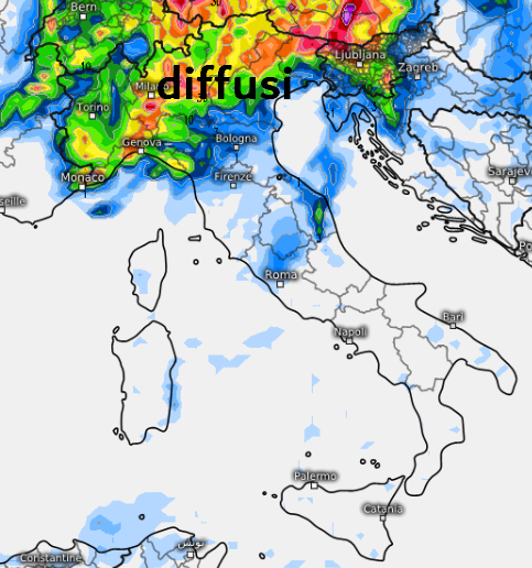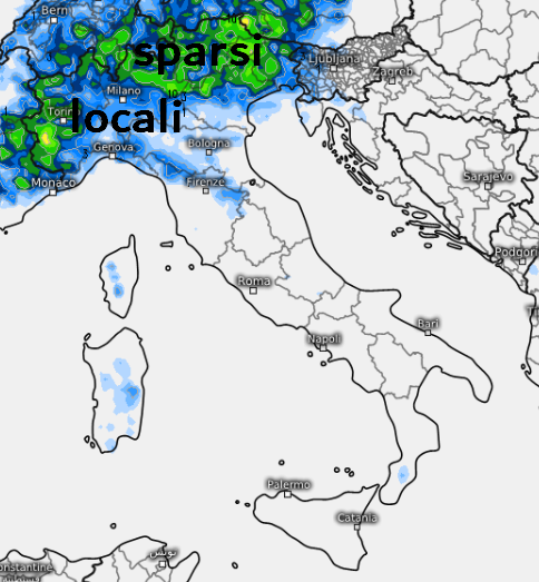 Qui la mappa dei temporali previsti secondo il modello ECMWF (vede fenomeni meno intensi rispetto al modello GFS ma sembra più credibile):