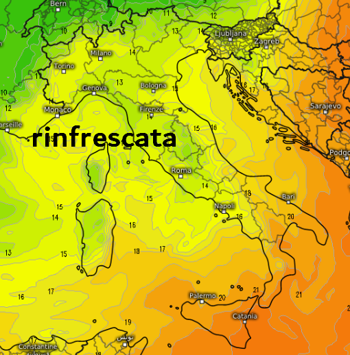 Qualche sporadico fenomeno raggiungerà anche parte delle regioni centrali, poi la saccatura sembrerebbe sfilare verso levante. Al suo seguito però ecco arrivare il Maestrale a spazzare via la grande calura anche dalle regioni centrali con un calo termico di almeno 7-8°C al suolo rispetto ai valori attuali, anche di 10°C in quota. Ecco infatti le temperature previste a 1500m per la mattinata di lunedì 7 luglio, il caldo resisterebbe solo sul meridione: