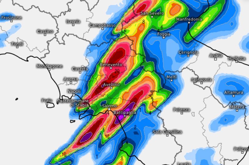 Il nucleo si muoverà in direzione in direzione ESE andando comunque a coinvolgere anche Caserta, Aversa, Napoli, Avellino, Benevento, Salerno e Battipaglia, con formazione di un secondo nucleo, più a sud del precedente. Entrambi si muoveranno alla conquista della Puglia, dove giungeranno un po’ scarichi, ma sempre in grado di dispensare precipitazioni, specie tra Foggia e Cerignola: