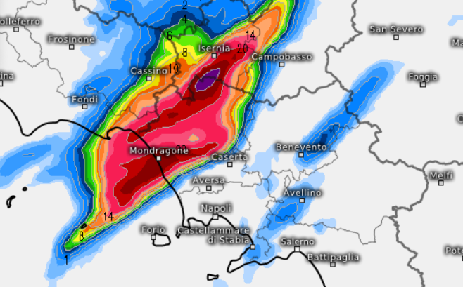 In particolare tra Campania, Molise e Puglia è attesa la formazione di focolai di origine marittima in successivo trasferimento nell’entroterra con accumuli di pioggia anche consistenti, come vediamo da questa mappa, con le precipitazioni in movimento da Mondragone verso le zone interne sino a sfondare in Molise, tra Isernia e Campobasso: