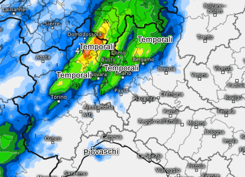 Temporali tra alto Piemonte e medio-alta Lombardia, anche piuttosto intensi tra Lago Maggiore, Comasco, Varesotto, Lecchese e Bergamasca. Coinvolto anche il Novarese, alto Milanese, Brianza e marginalmente il Pavese. Contemporaneamente, si accenderanno alcuni piovaschi sul golfo ligure, ma in genere senza attività elettrica. Su tutte le altre regioni fenomeni assenti o poco probabili.