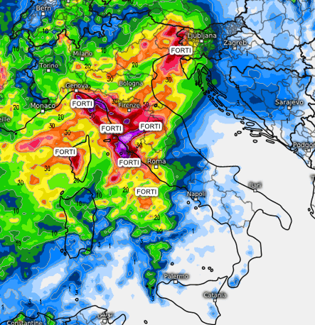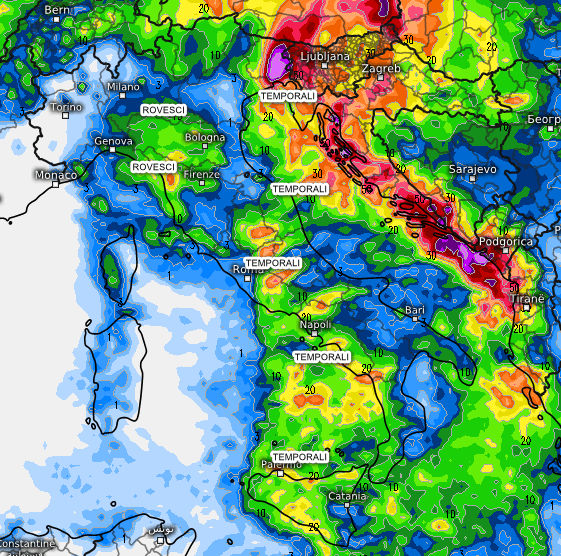 Rischio di rovesci e temporali anche intensi, associati a nubifragi e colpi di vento su Liguria, Toscana, Umbria occidentale, Lazio, Trentino, Veneto e Friuli. Rovesci anche sulla Sardegna e piogge sul restante settentrione, ma in prevalenza moderate. Tempo invece più asciutto al sud e sulla Sicilia. Ulteriore calo termico al nord e al centro, mentre al sud sarà presente ancora un po’ di caldo.