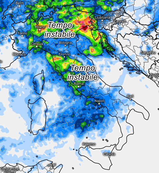 Tempo instabile al nord, specie al nord-est, con temporali e rovesci sparsi specie sul settore centrale ed orientale. Tempo molto instabile anche al centro, su Toscana, Umbria, Marche e alto Lazio. Più ai margini invece la Sardegna, l’Abruzzo e il Meridione ad eccezione forse della Campania che avrà rovesci.