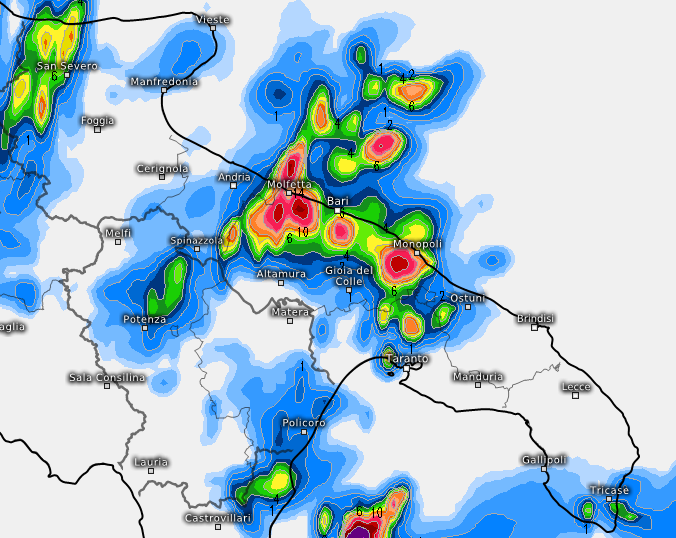 Molfetta, Bari, Monopoli, poi Ostuni, con i nuclei attesi prima dell’alba su Brindisi, Manduria e Lecce. Anche Altamura e Gioia Del Colle potrebbero ricevere rovesci, ma meno intensi rispetto a quelli che si prevedono sulla costa del Barese.
