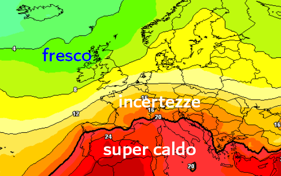 Infatti il grande caldo proverà ad inserirsi sul Mediterraneo centrale solo da venerdì 8, dopo alcuni tentennamenti, provocati inizialmente dal passaggio della saccatura colma di temporali tra venerdì 1 e lunedì 4 e poi da un potenziale passaggio di un impulso freddo sulle Venezie nella giornata di mercoledì 6.