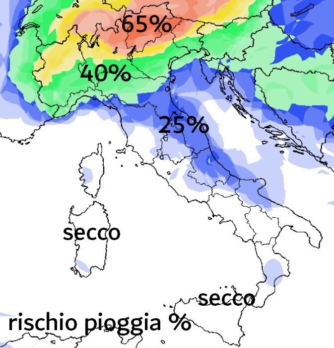 Così come, per rendere più popolare ed accessibile la spiegazione tecnica, ci pareva giusto riassumere in quest’altra mappa, riferita alla probabilità di precipitazioni, espressa con una scala di colori, il rischio in percentuale di fenomeni da qui a Ferragosto sul nostro Paese: