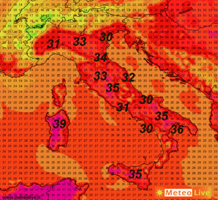 Segnaliamo 39° nelle zone interne della Sicilia, 36° sulla bassa Lucania, 35° nelle zone interne della Sicilia e sulla Puglia.