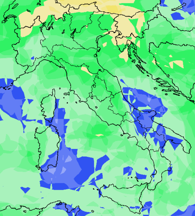 E in verde abbiamo voluto rappresentare la probabilità di pioggia sull’Italia proprio intorno al 19-20 ottobre, non altissima, ma comunque sufficiente a non interrompere il trend che si è instaurato da settembre. Certo: l’ideale sarebbe che piovesse soprattutto al sud, ma il tempo non va a comando.