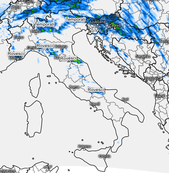 Infine, l’ultima cartina mostra i temporali attesi in Italia tra le 2 e le 8 di martedi 27 maggio: