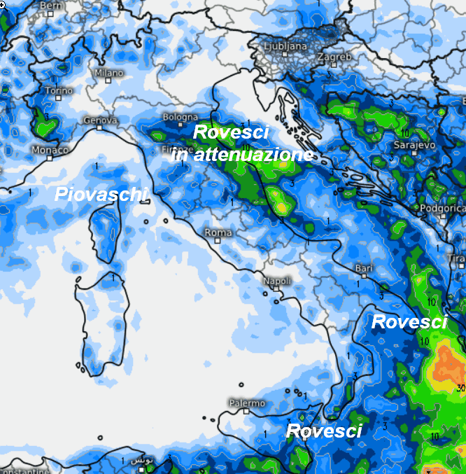 Ancora rovesci tra Romagna e Marche, ma in via di attenuazione nell’arco della giornata. Piovaschi anche all’estremo sud e su alcuni settori del nord-ovest, ma con accumuli non abbondanti, per il resto fenomeni poco probabili.