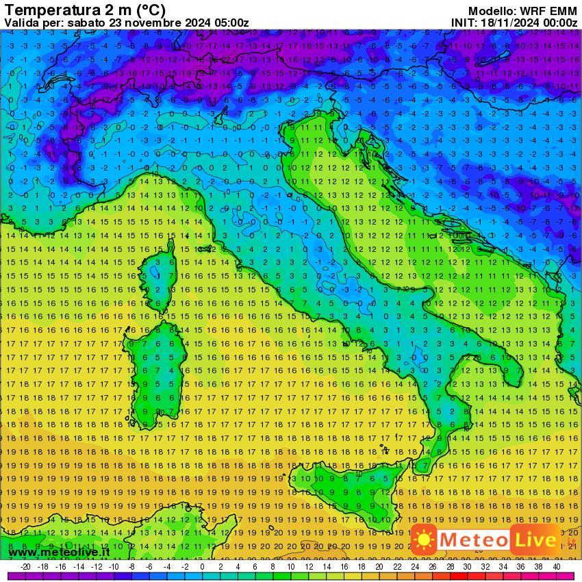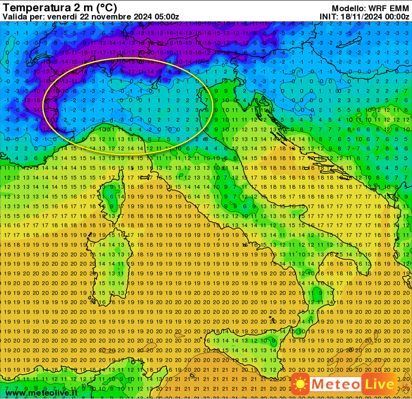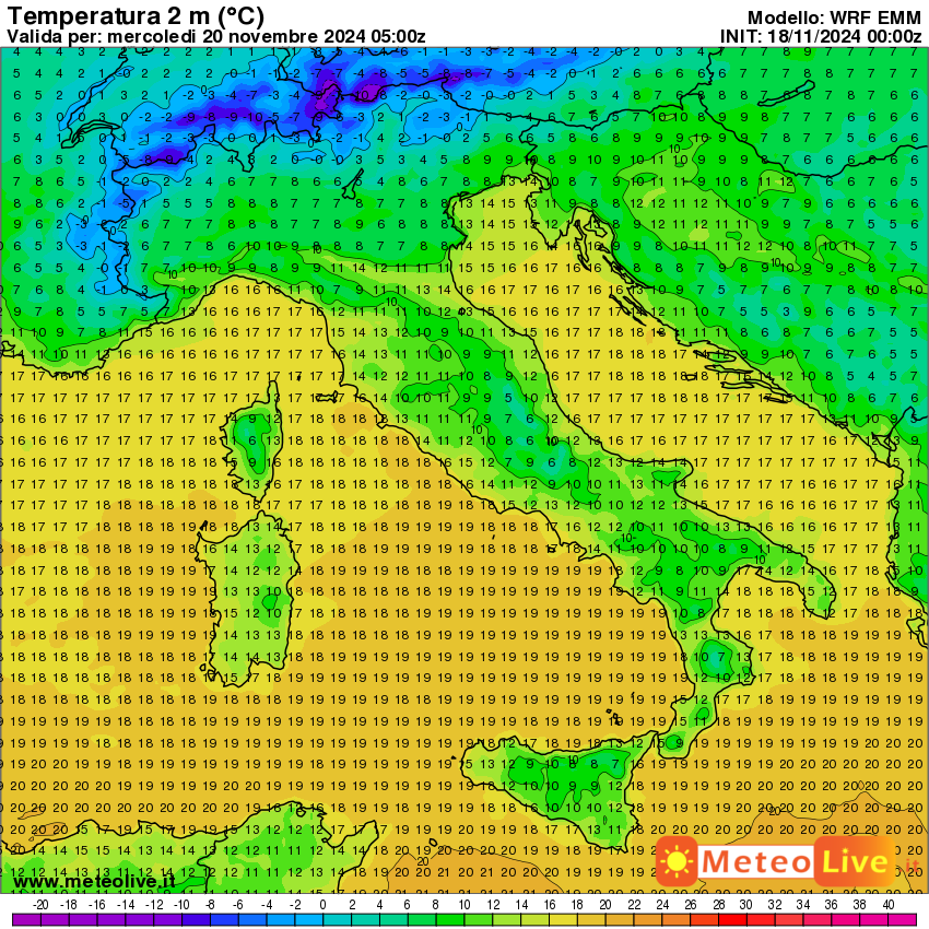 Vediamo adesso gli effetti termici al suolo. La prima mappa mostra le temperature attese in Italia alle ore 6 di mercoledi 20 novembre, prima dell’arrivo dell’aria fredda: