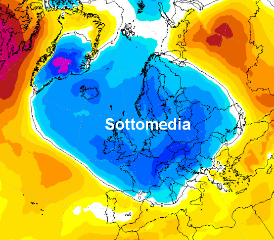Notate il vasto lago freddo che sarà presente su gran parte del nostro Continente, con risvolti anche in Italia. Dove vedete il blu scuro si prevedono temperature fino a 6-7° inferiori alle medie stagionali.