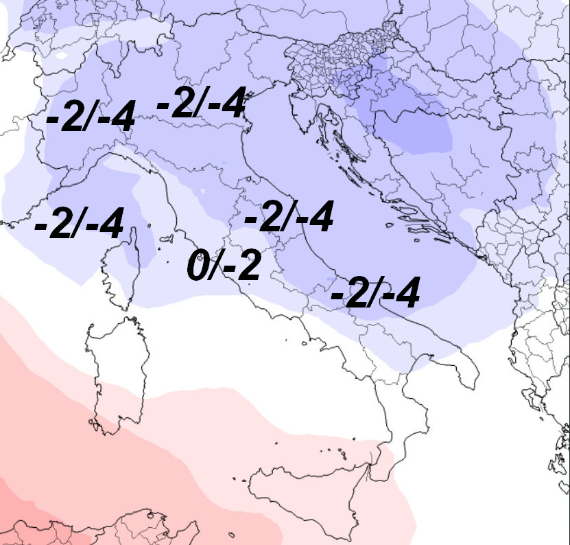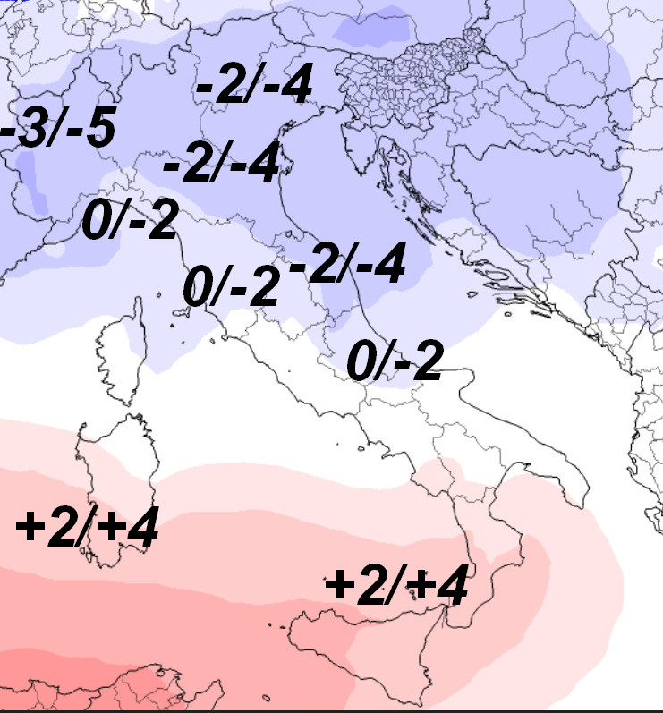 Clima abbastanza freddo per il periodo al nord-ovest, tra i 3 ed i 5° inferiori alla media termica del periodo. Tra 2 e 4° inferiori alle medie sul resto del nord e sull’alto-medio Adriatico; tra 0 e 2° sotto media sul centro peninsulare mentre sulle Isole e la Calabria avremo aria tutta diversa con esuberi termici dalla media fino a 4° sulle Isole.