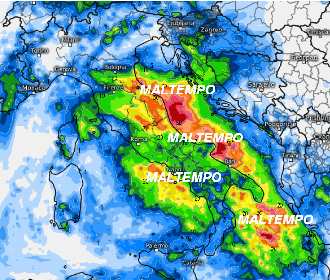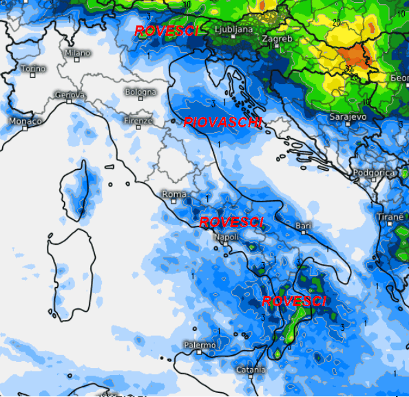 Il maltempo sarà presente su gran parte del centro e del meridione, specie lungo il versante adriatico dove avremo i fenomeni più forti. Le precipitazioni tenderanno poi a risalire verso alcune aree del settentrione a partire dall‘Emilia Romagna. Precipitazioni più scarse invece su Sardegna, Sicilia ed estreme regioni meridionali. Temperature in calo su tutte le regioni, specie nelle aree raggiunte dai fenomeni.