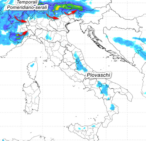 Al nord, dopo la fase di relativa “stanca” che sarà presente tra la tarda mattinata/primo pomeriggio, ripresa dei rovesci da metà pomeriggio ad iniziare dalle aree montuose (Ovest Alpi, bassa Val d’Aosta, Sesia, Ossola, zona Laghi, alto Veneto e Trentino); intensificazione dei fenomeni medesimi tra pomeriggio e sera, con possibili sconfinamenti verso le aree di pianura adiacenti ai rilievi, specie in serata. Possibili occasionali grandinate sotto i rovesci più intensi.