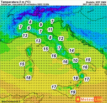 Valori inferiori a 10° sulle pianure del nord ed a tratti nelle aree interne del centro. Più mite il Tirreno e le Isole con punte di 18-19° su Sardegna e Sicilia.