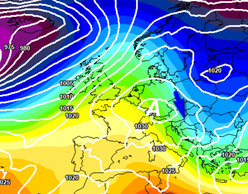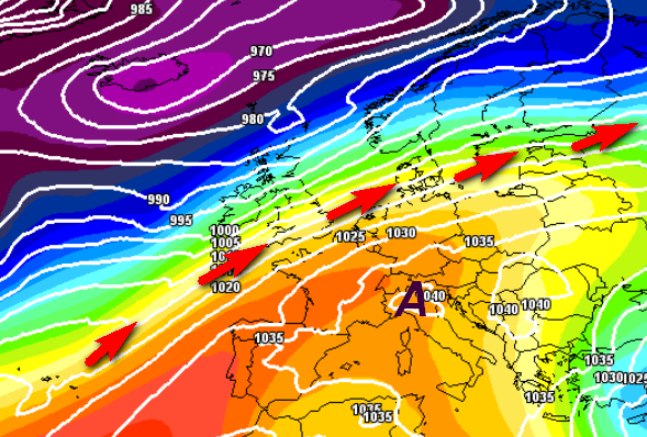 L’accelerazione delle correnti da ovest, unitamente al rialzo del fronte polare verso nord e all’inserimento di una vasta area di alta pressione, entro mercoledì 23 ci lascerà tutti nel tempo stabile, soleggiato e progressivamente più mite, salvo nelle aree interessate da nebbie. Ecco la mappa: