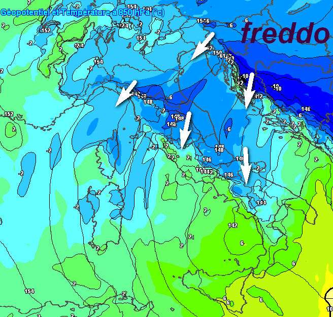 Nella mappa successiva ecco le temperature previste a 1500m per le ore 10 di sabato 20 gennaio, dove si nota la massima estensione del freddo lungo il versante Adriatico e invece i primi segnali di attenuazione al nord. Le aree più fredde risulteranno quelle dell’Appennino emiliano e marchigiano: