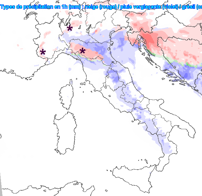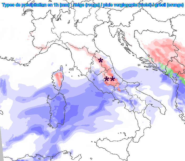 Qui la mappa del modello francese Arpège prevista tra il tardo pomeriggio e la sera di venerdì, dove si nota in rosso le aree dove maggiormente probabili risulteranno le nevicate: come vedete l’aria fredda qui non ha ancora sfondato bene sul medio e basso Adriatico, ma lo farà rapidamente nella notte su sabato: