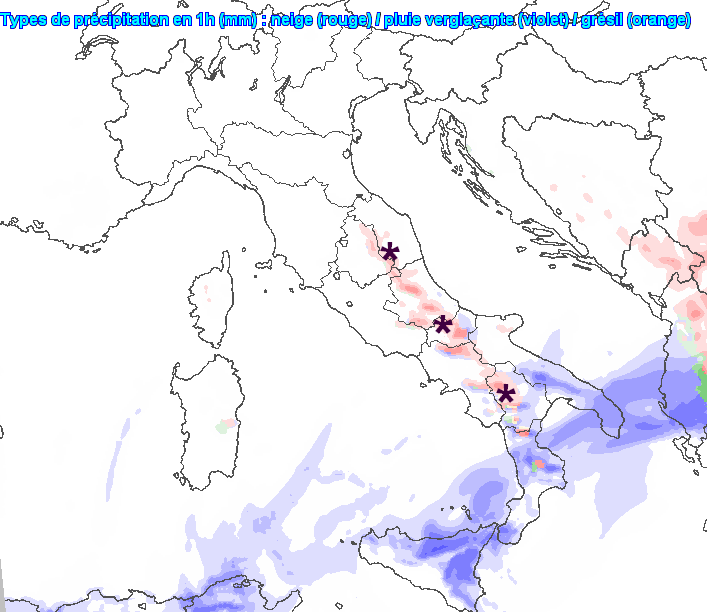 Ecco comunque la sequenza delle precipitazioni che si riferisce alle prime ore di sabato e poi al pomeriggio, notare come la neve guadagni spazio verso l’Appennino meridionale, anche se paradossalmente, proprio muovendosi verso sud, perderà di intensità: