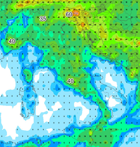 Sull’Italia centro-meridionale, sulla Liguria e sulle basse pianure del nord notiamo complessivamente poca pioggia, addirittura quasi assente sulla Sardegna, la Lucania, la Puglia ed in Liguria. I massimi piovosi sono attesi sull’arco alpino orientale, tra i 60 e gli 80mm. Pioverà anche sui rilievi piemontesi e sulla Val d’Aosta con circa 40mm.