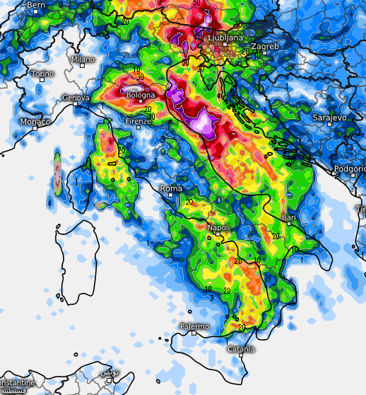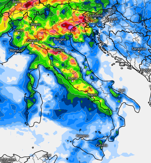 Rimane da verificare la piovosità attesa tra Romagna, Marche ed Abruzzo, così come sul basso Tirreno, che secondo alcuni modelli potrebbero risultare ben più rilevanti, anche sino a 500mm di accumuli in meno di 48 ore.