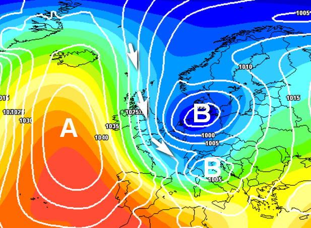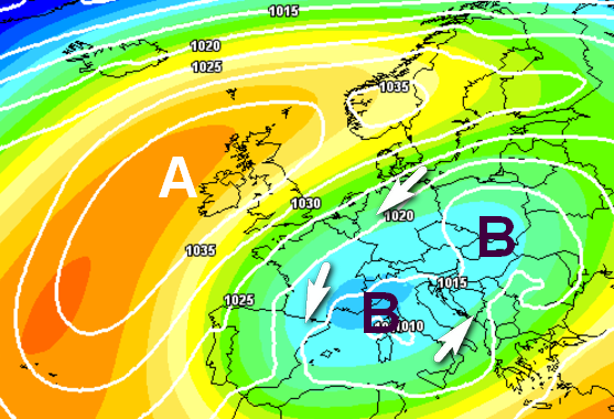 Il quadro barico che potrebbe preludere a queste nevicate, comunque non particolarmente abbondanti, (si tratterebbe di poco più di una spruzzata, almeno al momento), lo possiamo vedere qui: