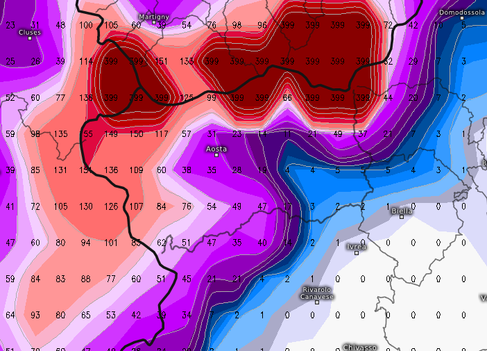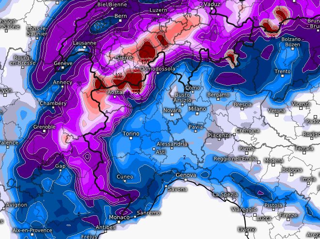 Il passaggio perturbato tra Sant’Ambrogio e l’alba dell’Immacolata porterà molta neve sul settore nord occidentale e settentrionale della Valle d’Aosta, sulle vallate superiori dell’Ossola (Formazza e Passo del Sempione), sia pure in misura decisamente minore, poi sull’alta Leventina in Canton Ticino, specie tra Piotta ed Airolo. Si prevedono accumuli anche superiori ai 30cm tra Courmayeur e la Val Ferret.