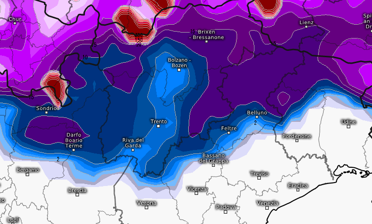Le nevicate più copiose sono però attese tra l’alta Valtellina, Val di Lei (Madesimo e Livigno in primis) l’Alto Adige e il Tarvisiano, specie oltre i 900-1000m, con fiocchi abbondanti tra Bressanone e il confine di Stato ma con neve ovviamente su tutte le vallate laterali dalla Val Ridanna alla Val di Vizze, dall’alta Venosta alla Pusteria e alla Valle Aurina, nevicate più deboli ma presenti su Orobie, Val Camonica, passo del Tonale, Dolomiti del Brenta. Neve anche su tutto il settore dolomitico, dalla Val di Fassa alla Val Gardena, da Cortina a Sappada. Neve intesa invece tra Carnia e Tarvisiano, che persisterà anche nella notte su domenica 8 dicembre: