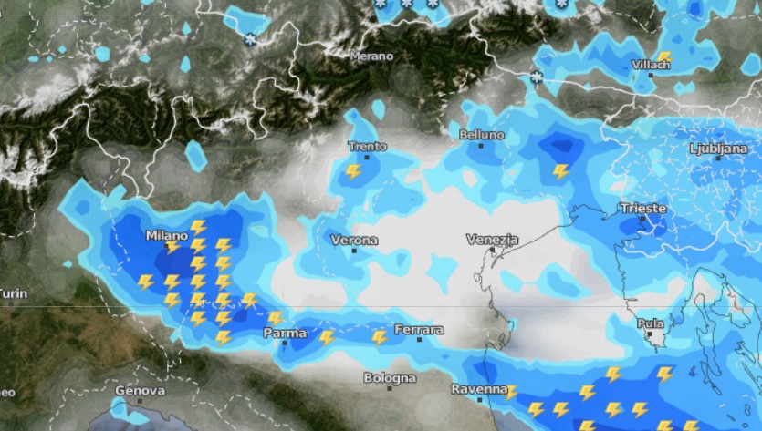 In serata l’inserimento di aria più fredda a tutte le quote andrà a favorire una recrudescenza temporalesca sul catino padano, specie nel Milanese e sul Lodigiano, poi di riflesso anche su Piacentino, Parmense e fino al Ferrarese, rovesci sparsi seguiteranno a presentarsi sul Veneto e sul Friuli, come vediamo da questa mappa tratta dal modello ICON su base grafica Wetterdienst:
