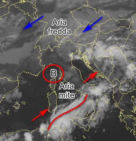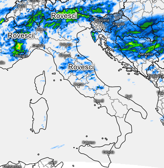 La situazione resta inaffidabile sull’Italia, al netto della presenza di schiarite. Notate l’aria fredda che interessa i settori a nord delle Alpi, ma in queste ore anche le regioni settentrionali italiane. Viceversa, aria molto più mite di matrice afro-mediterranea porta un fronte caldo sulle regioni meridionali. Dal contrasto tra queste due diverse masse d’aria nasce una depressione semi stazionaria tra il Mar Ligure e la costa Azzurra che muove tutta l’instabilità italica che si accende in maniera abbastanza prepotente nelle ore pomeridiane e soprattutto nei settori interni.