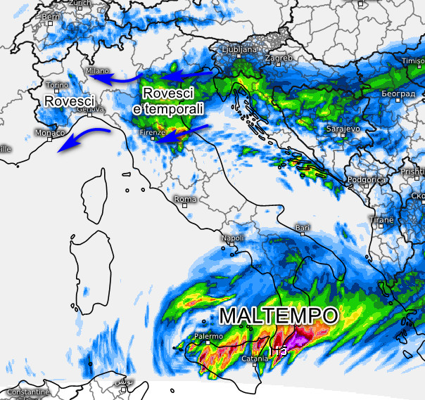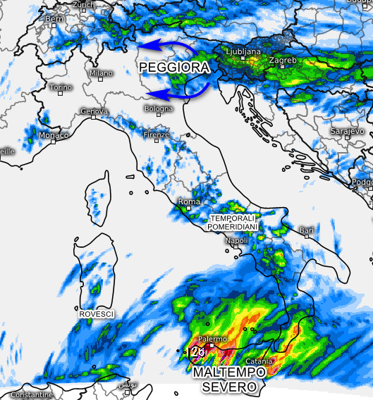 MALTEMPO SEVERO sulla Sicilia e il sud della Calabria con temporali intensi che potrebbero determinare allagamenti e dissesti. Più sporadiche le piogge sul resto del meridione e concentrate essenzialmente nelle aree interne. Rovesci nel sud della Sardegna e temporali pomeridiani nelle aree interne del centro. Al nord situazione tranquilla, ma peggiora in serata sul nord-est con temporali ed un rinforzo del vento da est.