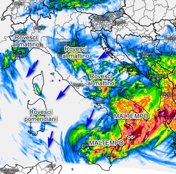 Situazione molto dinamica stante l’arrivo di correnti fresche da nord-est. Ancora MALTEMPO al sud specie sul settore ionico ed ancora in Sicilia con piogge e temporali anche intensi. Nell’arco della giornata il maltempo inizierà a mollare la presa a partire dalla Sicilia e dal Tirreno. Rovesci al mattino su gran parte del versante adriatico e sulla Romagna, ma con fenomeni in lenta attenuazione nell’arco della giornata. Al primo mattino rovesci anche tra ovest Lombardia, Piemonte e Alpi occidentali, in attenuazione nell’arco della mattinata. Da segnalare anche qualche rovescio pomeridiano sulla Sardegna sud-orientale, ma in attenuazione in serata. Venti in rinforzo da nord-est quasi ovunque e temperature in calo specie sotto i rovesci più forti.