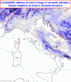 SITUAZIONE: condizioni di instabilità coinvolgono ancora l’Italia, sorvolata da aria fresca in quota, che favorisce nel pomeriggio l’insorgenza di temporali sparsi sulle zone interne peninsulari. Oggi i fenomeni risulteranno più probabili al nord, lungo