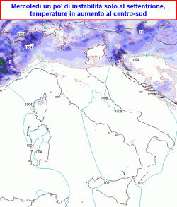 Oggi e domani un po' di instabilità sulle zone interne peninsulari, più sole sulle isole maggiori. Mercoledì un po' instabile al nord, netto rialzo termico al sud e sulle isole, moderato al centro. Giovedì temporali anche forti al nord, variabile al centro, ancora molto caldo al sud e sulle isole. Venerdì e sabato variabile tra nord e centro con locali fenomeni, al sud ancora caldo intenso sino a domenica.